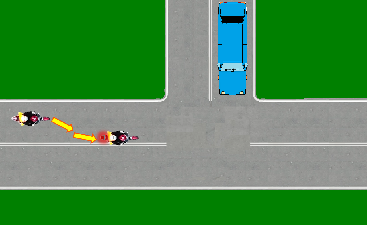 The answer is you need to stop with a car space length between you and the stop line and wait until the vehicles behind have stopped. When they provide a buffer for you, you can move forward. By provide a buffer we mean they, being stopped, are a sufficient barrier to you getting hit from the rear. The space you are leaving is in the case that no one stops in time behind you you can move forward into that space. Remember to be in the ready position when stopped so that you can move off quickly again if you need to in an emergency. The general take away with this one, is to know who is behind you and adjust accordingly, this leads into the next case