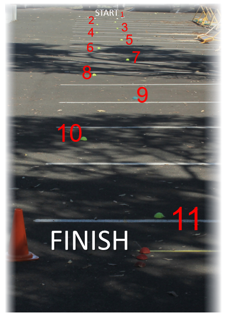 11 half tennis balls placed in a line 4.0m apart with each cone alternately offset perpendicularly from the centre line by 30cm.